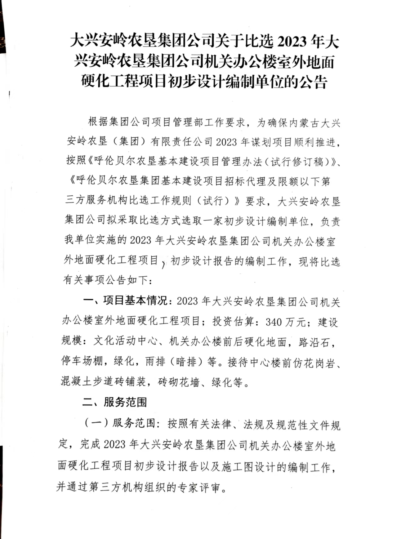 4大兴安岭农垦集团公司关于比选2023年大兴安岭农垦集团公司机关办公楼室外地面硬化工程项目初步设计编制单位的公告.jpg